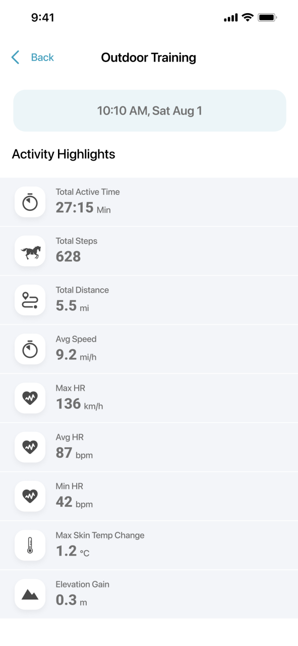 Tekintsd át az aktivitás utáni adatokat a Blaze mobilalkalmazásban, beleértve a regenerációs rátát, a pulzuszónákban töltött időt, a bőrhőmérsékletet, az aktivitás kiemeléseit és még sok mást.