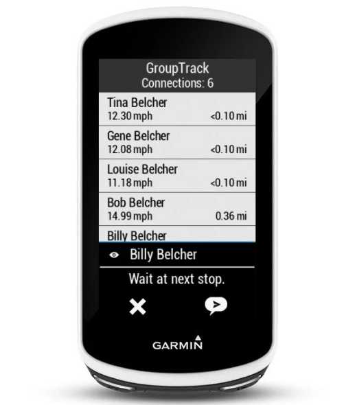 A Group Track több típusú Garmin készüléknél működik, s a túra/ edzés indításkor összekapcsoljuk a csapatot egy csapattá. Így látjuk ki hol van a térképen. Most a telefon elővétele nélkül tudunk üzenetet küldeni a csoport tagjainak, amit ráadásul előre megírhatunk, így gyors lesz a kommunikáció. Tehát egy defektet kapunk, rányomunk a készülékre, s mindenki más megkapja az üzenetünket a csapatba, hogy lemaradtam, defektet szerelek. Természetesen mindehhez telefonra is szükségünk van, hiszen a telefont használja a 1030 minden ilyen funkcióra.