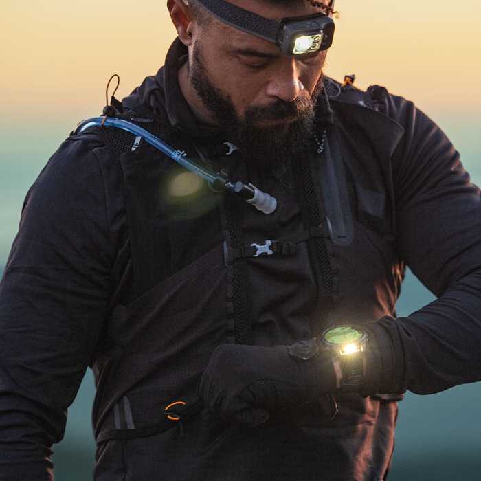 Ez a valódi integrált zseblámpa változtatható fényerővel és piros fényfunkcióval rendelkezik, hogy jobb látást biztosítson sötétben, és kényelmes megvilágítást nyújtson, amikor szükséged van rá. A villogó üzemmód pedig akár a futásod ritmusához is igazítható.