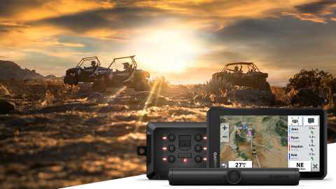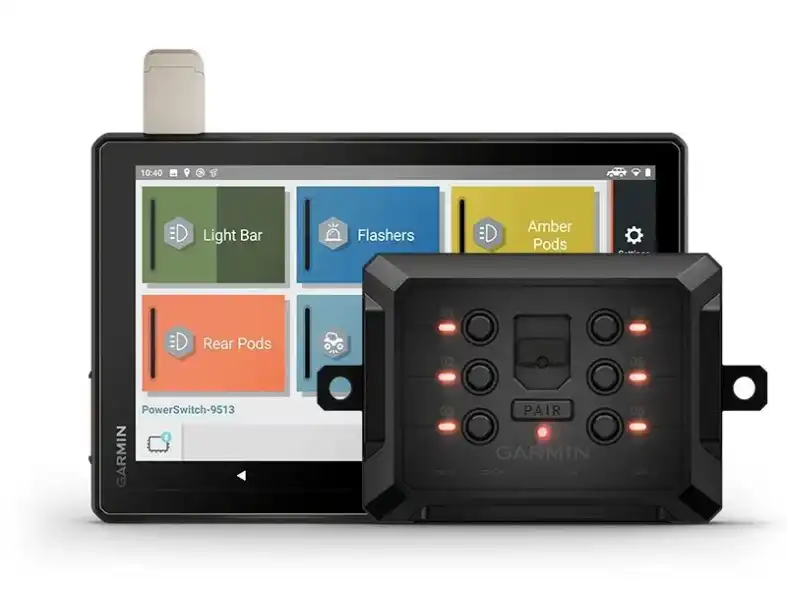 Párosítsd a Tread eszközt a kompatibilis Garmin PowerSwitch™ digitális kapcsolódobozzal (külön megvásárolható), hogy képernyőn keresztül vezérelhesd a jármű 12 voltos elektronikáját — például a fényhidakat, differenciálzárakat és egyebeket.