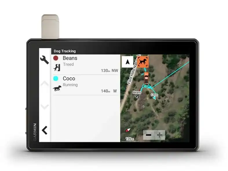Vezeték nélkül párosítsd a Tread eszközt bizonyos Garmin GPS kutyakövetőkkel (külön megvásárolhatók), hogy nyomon követhesd és visszatalálhass vadászkutyáidhoz a terepen. A követési tartományon belüli kutyák jelölései megjelennek a navigáció térképén.