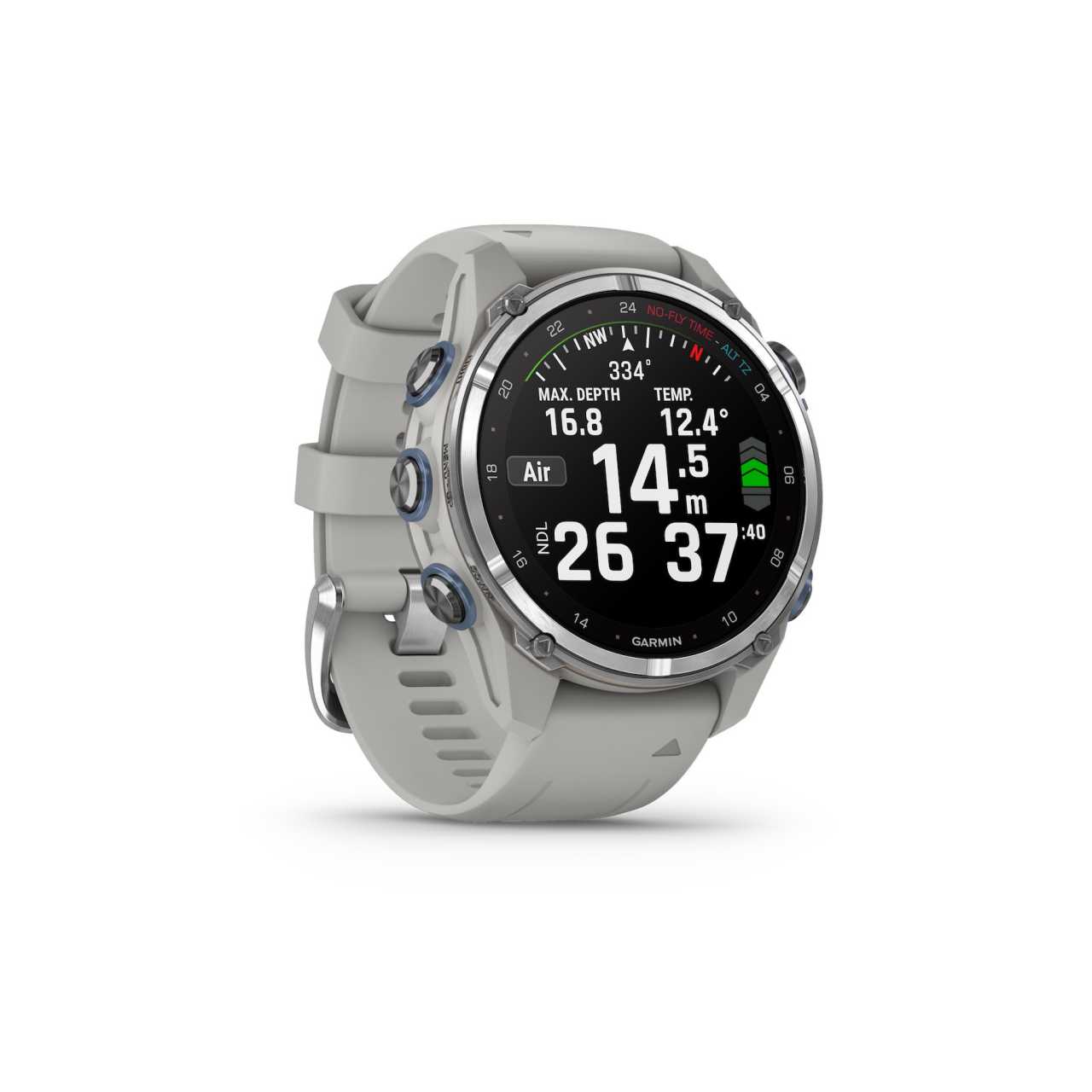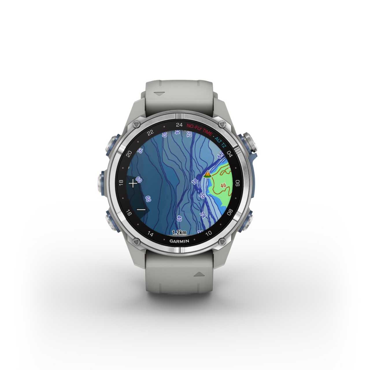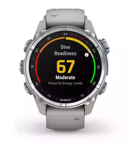 Egy 2023-as női búvár és multisport okosóra, titánl lünettával, ködszürke ház és szíj, AMOLED kijelző.