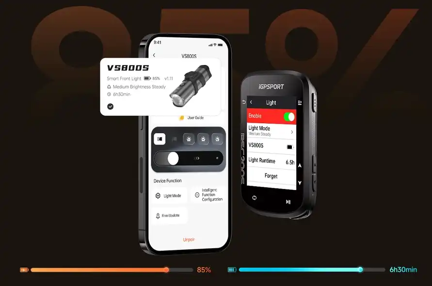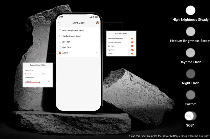 Állítsd be a kívánt fényerőt és világítási módokat az iGPSPORT alkalmazásban (5 üzemmód érhető el, a nem használt módok kikapcsolhatók), így minden tekerés pontosan az igényeidhez igazodik.