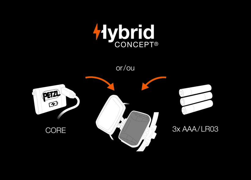 HYBRID CONCEPT: tölthető CORE akkumulátor mellékelve, de az IKO CORE három AAA/LR03 elemmel is kompatibilis. A lámpa felismeri az energiaforrást, és ahhoz igazítja a fényerőt (IKO CORE elemekkel = 350 lumen).