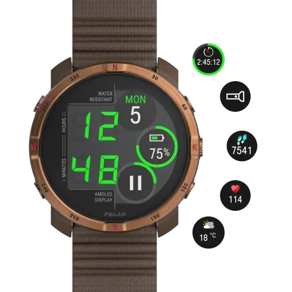 A terepen és azon kívül is otthon érzi magát – fejlett edzés-, regenerációs- és bioszenzoros funkcióival segít, hogy messzebbre juss, és kihozd magadból a legtöbbet. A karcálló zafírüveggel fedett AMOLED kijelző minden körülmények között éles képet ad, a kétfrekvenciás GPS pedig pontos helymeghatározást és színes térképes navigációt biztosít, beleértve a kanyar-kanyar utasításokat is.