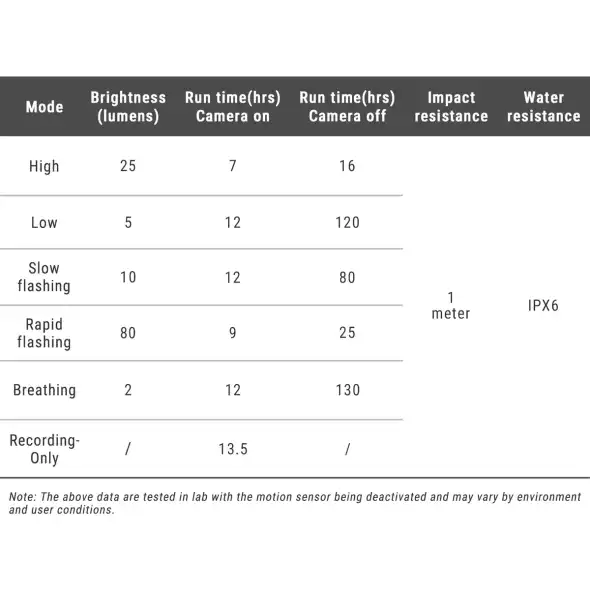 Egyetlen feltöltéssel akár 130 órányi folyamatos használatot biztosít, így hosszabb túrákon is megszakítás nélkül használható, még akkor is, ha a kamera és a hátsó lámpa egyszerre működik.